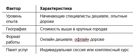- Опыт и экспертиза специалиста: Консультант с 10-летним опытом и известным именем в отрасли будет стоить дороже начинающего коллеги.